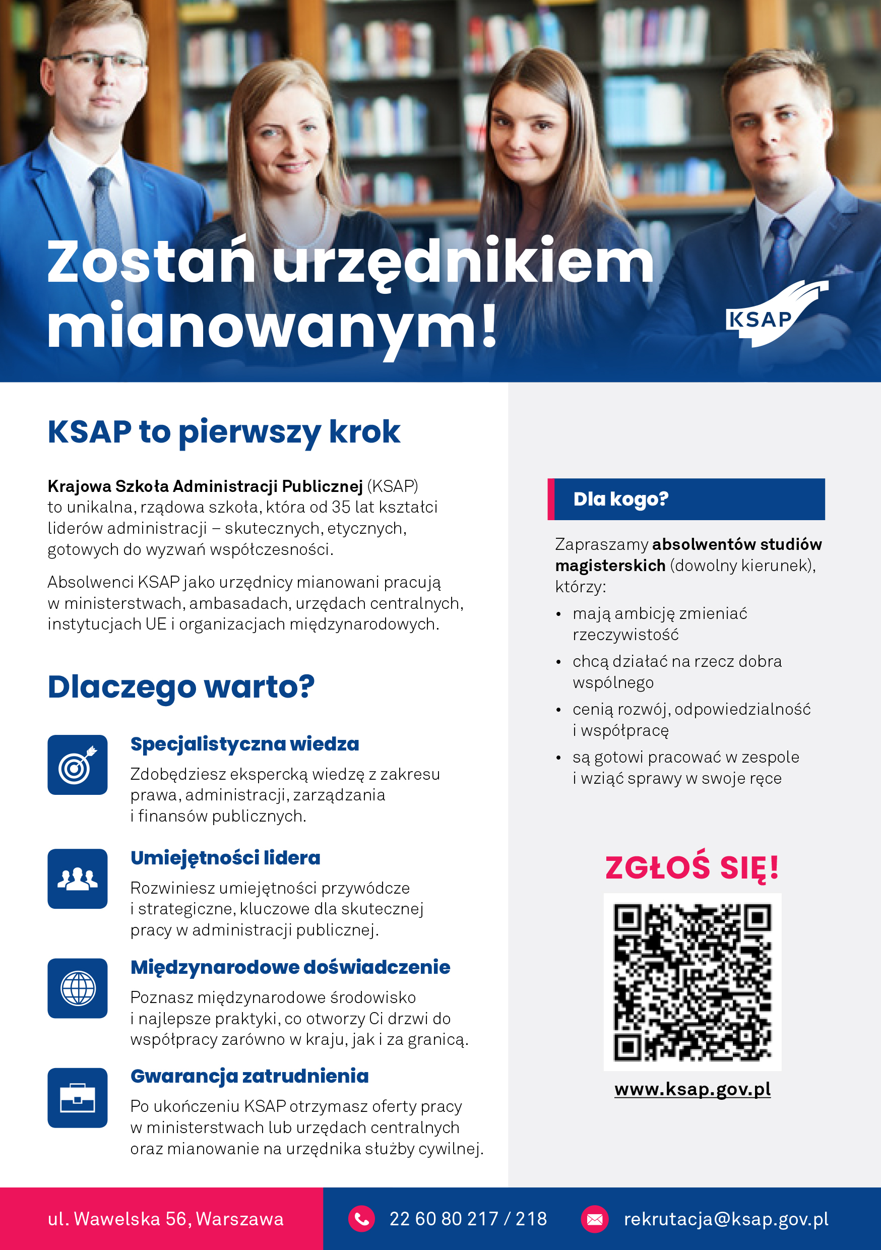 Od 28 kwietnia do 18 sierpnia 2025 roku trwa rekrutacja do nowej edycji kształcenia stacjonarnego KSAP, adresowanego do absolwentów wszystkich kierunków studiów magisterskich, którzy chcieliby związać swoją przyszłość z pracą w służbie publicznej.